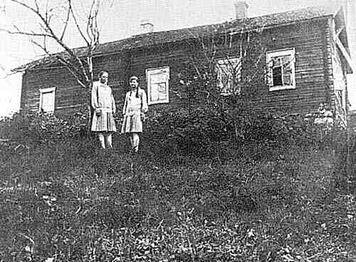 | B3-21-001 : (ATK: Hilja ja Onni Salminen sekä lapset Airi ja Riitta talonsa edessä Luhovaaran kylässä.)(PD: Simo Hiekan eli Simo Jussilaisen talo Luhovaaran kylässä.)