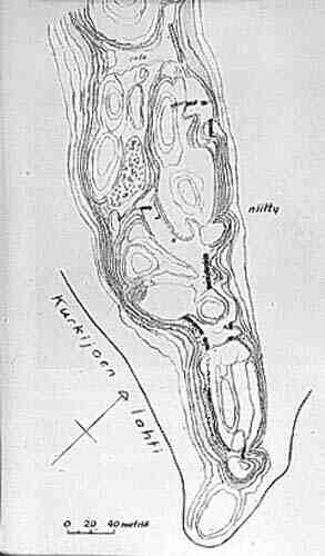 Kurkijoen Lapinlahden kylää ja sen noin 3 kilometrin pituinen vuono, joka päättyi Jätjärveen. Valok. Johan Kauppi.