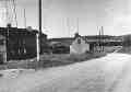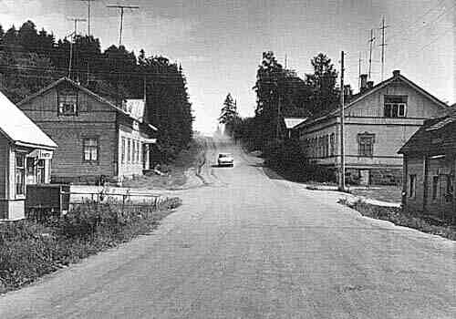 Näkymä Elisenvaaraan päin. Tien oikealla puolella rakennukset ovat entisiä, mutta vasemmalla puolella nökyy uuden kaksikerroksisen talon nurkkaus. Myös vanha ränsistynyt rakennus suojeluskunnan talon kohdalta on purettu.