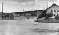 Maamiesopiston aluetta joen yli. Vasemmassa reunassa meijerirakennus, seuraava karjanhoitokoulun rakennus ja alaruokala. Joen varressa omituisia matalia rakennelmia.