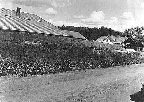 Maamiesopiston alueella oli navetan viereen tehty korkea multavalli. Valkoinen rakennus on meijeri. Taustalla Hiidenmäki. | B4-20-012-0319
