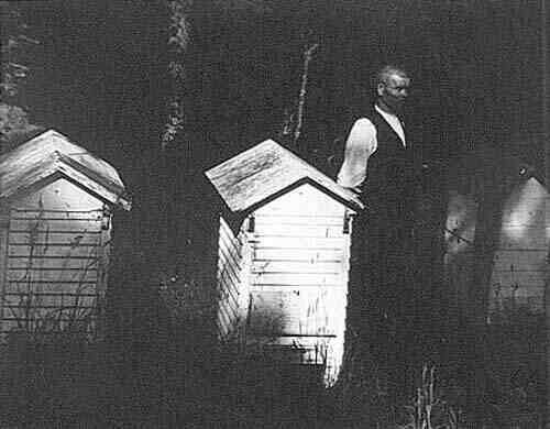 Alhon kansakoulunopettaja K.K. Tyrni mehiläispesiensä luona. C1-01-009-0384 | ||||||||||||||||||||||||||||||||||||||||||||||||||||||||||||||||||||||||||||||||||||||||||||||||||