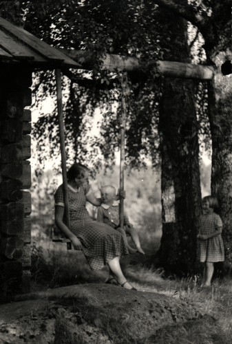Särkijärvi, Tattarimäki, keinu pajan seinustalla, Helvi Kiiski, Esa Asikainen, Nelly Asikainen. K. vv. 1930-39/ P. Kyytinen | (C1-39-016) (ja018)