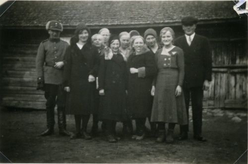 Liekari, Aino Sikiö, Miina Liekari, Eeva Liekari, Maija Huittinen, Eero Huittinen. Liekarin joku rakennus takana. "Silloin oli nuoriso tiloja taloissa missä kokoontuivat nuoret ja vanhatkin mukana".