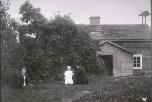 Kappalaisen pappilan tuparakennus. Pihalla kuvan keskellä knallipäinen kappalainen Gustav Petterson (myöh. Arokallio) tyttärensä Elsan kanssa. (d072)