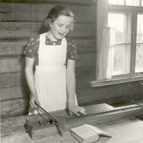 Virsikanteleen käyttö oli Kurkijoella varsin tuttua. Rippikoulussa piti jokaisen osata soittaa nuoteista ainakin kaksi virttä jalalla tahtia polkien. Kuvassa Martta Pörsti soittaa virsikannelta Kurkijoen Särkijärven Kyytisen tuvassa. Vasemmalla on Kerttu Kyytinen.