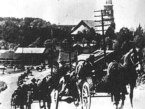 Antti Kiiskin hautajaissaattue matkalla kohti Otsanlahden hautausmaata. Vanhan tavan mukaan vainaja lähti viimeiselle matkalleen kotoaan. Kuvassa hautajaissaattue on Postirinteessä Lopotissa.