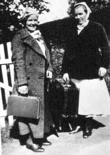 Diakonissa Enni Repo (oikealla) ja terveyssisar Maija Jokela (vasemmalla) lähdössä kotikäynnille Kurkijoella 1930-luvulla. G1-00-004-1162