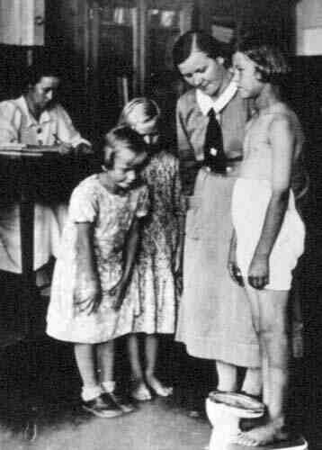 Terveystarkastus Alhon kansakoulussa. Terveyssisar Maija Jokela (myöh. Railo ) punnitsee oppilasta. Pöydän takana istuu opettaja Kaarina Härkönen.