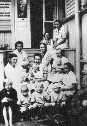Suomen Huollon synnytystupa ja Suomen Huollon lastensairaala Viitasaarella v. 1941. Edessä vasemmalla istuu vauva sylissään Kurkijoen kätilö Ilma Malinen. Takana oikealla ylinnä Maija Veijalainen, joka oli töissä sairaalassa.