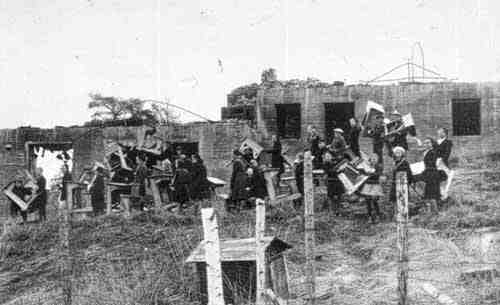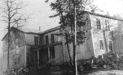 Koulun lähellä sijainnut Ina Relanderin talo oli säilynyt ja sen suojiin majoittui koulun ensimmäinen ja ainoa luokka syksyllä 1942. Opettaja Saimi Hukkanen näkyy takana vasemmalla.