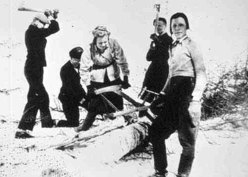 Elisenvaaran yhteiskoululaisia mottitalkoissa. Lukuvuonna 1943-44 oltiin mukana sota-ajan toiminnassa. Yli 15 vuotiaat oppilaat hakkasivat yli 100 mottia koivuhalkoja ja opettajat 54 mottia. Näillä piti lämmittää koulutaloa seuraavana talvena, mutta syyskuussa tuli muutto Suolahteen.