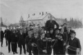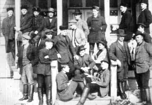 Kurkijoen ylemmän maan-viljelyskoulun oppilaita. Kes-kellä keppi kädessä seisoo pehtori Oskar Heinonen.