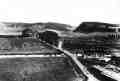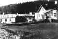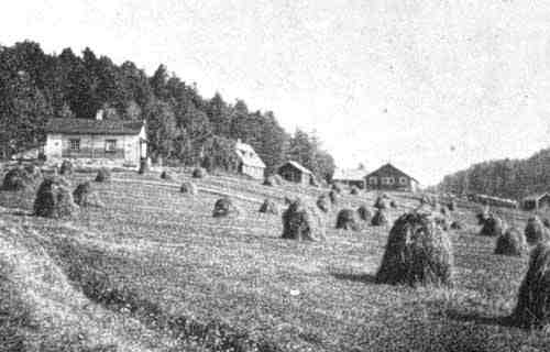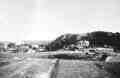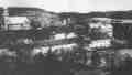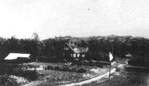 Kurkijoen koulutilaan kuuluneita rakennuksia. Oikeassa reunassa Lopotin Linnamäki. Sen juurella nä-kyy pehtori Oskar Heinosen asunto, joka paloi v. 1937.