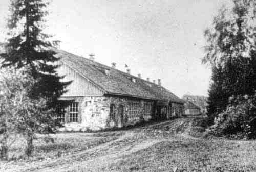 Kurkijoen maamiesopiston pihaa 1941. Pihalla seisoo konstaapeli Robert Huolman. Kuvassa näkyvät rakennukset ovat kaikki ulkorakennuksia.