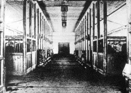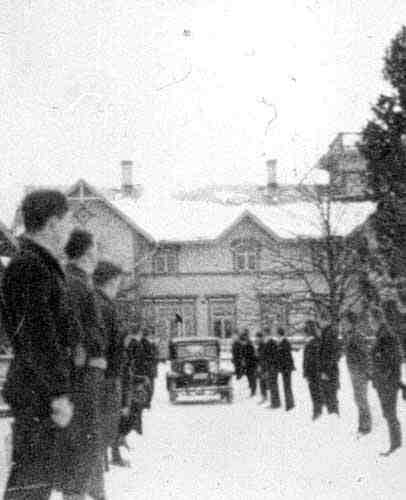 Navettavuorossa olevia Kurkijoen maamiesopiston poikia yhdessä karjanhoitajien kanssa. Taustalla Kurkijoen koulutilan jykevää kivinavettaa.