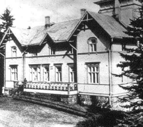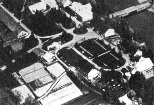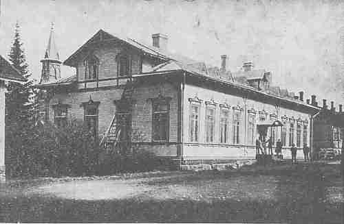 Kurkijoen maamiesopiston aluetta. Kirkon kohdalla oppilasasuntola, aivan kuvan keskellä oppilasruokala, tornilla varustettu rakennus johtajan asunto ja opiston konttori ja sen kohdalla asuinrakennus, jossa viimeksi asuivat konsulentti Kalle Huttunen ja metsänhoitaja Toivo Castrén.