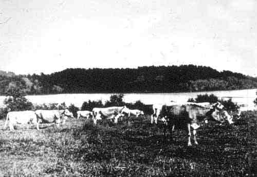 | Kurkijoen koulutilan karjaa laitumella Iivoniemessä Paratsun kohdalla. Taustalla Kuuppalan kylää ja Himohirsi. Epäselvä kuva : M3-20-033-2150
