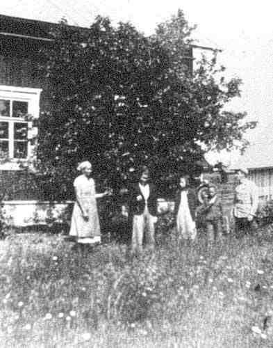 Kurkijoen "Kesto"-ome-napuu Marianvaarassa Lankisen puutarhassa. Omenalajike oli kehitetty Kurkijoen maamies-opistolla. Vas. Lankisen emäntä, Sirkka Räsänen, Ilmi Räsänen, Toivo Räsänen ja Rainar Hakulinen.