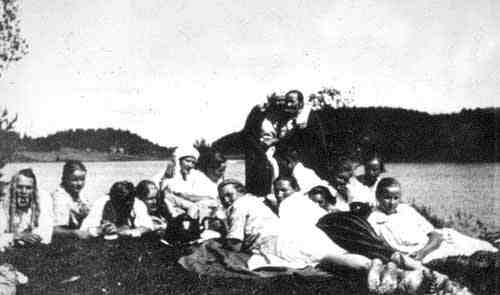 Kurkijoen karjanhoitokoulun oppilaita juhannuksena Laikkalalahdessa Paratsun tuntumassa sijainneessa Rak-kaussaaressa. Taustalla nä-kyy Kuuppalan kylän mäkiä.