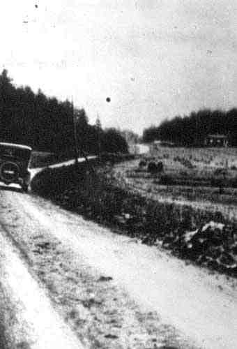 Kurkijoen koulutilan Kurkisiin karjatila maan-tien oikealla puolella. Kuvas-sa näkyy tilan asuinrakennus. Kuvan vasemmassa reunassa oleva auto on menossa Eli-senvaaran asemalle. (L0929)