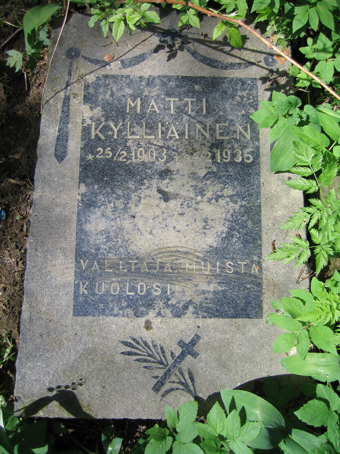 Otsanlahden uusi hautausmaaKesäkuun alun 2014 talkoomatkalla pääsin käyskelemään Otsanlahden uudella hautausmaalla mukanani GPS-paikannin, joka rekisteröi kuljetun reitin muistiin. Hautausmaastahan on hautapaikkaluettelo mutta ei -karttaa. Tarkoituksenani oli saada aikaan alueesta karttapiirros, sijoittaa siihen löytyneet suomalaishautojen muistomerkit ja näin myös ehkä selvittää, mitä salaperäiset myytyjen hautojen luettelon kirjain-numero -koodit tarkoittavat. Uudelle hautausmaallehan on myytyjen hautasijojen luettelon mukaan haudattu vuodesta 1925 vuoden 1942 huhtikuuhun mennessä noin 700 vainajaa. Jatkosodan loppuvuosista ei ole luetteloa. Sodan jälkeen tämä kalmisto on täyttynyt nykyasukkaiden haudoista. Viime vuosikymmenen kuluessa ovat kotiseutumatkailijat löytäneet alueelta kolmisenkymmentä suomalaisten hautamuistomerkkiä. Ei ole tiedossa, paljonko niitä alkujaan oli; vanhojen valokuvien mukaan mittava osa niistä oli puuristejä. Löytyneet hautakivet Kurkijoki.fi -sivuilla on kuvat ja luettelo 28:sta uudelta hautausmaalta löytyneestä hautakivestä tai puurististä. Alla on luettelo tämän kävelyn yhteydessä paikantamistani hautakivistä (nimen perässä syntymä- ja kuolinvuosi; lyhykäisyyden vuoksi vain yksi henkilö hautakiveä kohti on mainittu). En tavannut kaikkia aikaisemmin löydettyjä muistomerkkejä, mutta sen sijaan tunnistin viisi netin luettelossa mainitsematonta hautakiveä (lihavoitu luettelossa) ja yhden ”läkkiristin”, josta tiedot tosin olivat kuluneet pois. Jokaisen nimen jälkeen on luettelossani myytyjen hautojen luettelon koodi, kuitenkin niin, että alkuperäisen luettelon ensimmäinen roomalainen numero on korvattu arabialaisella(esim. IV à 4). Nimet on pantu tämän numeron mukaiseen järjestykseen. Tämä on itse asiassa se järjestys, jossa hautapaikat vuosien mittaan myytiin. Numero ja sitä seuraava kirjain osoittanevat alueen, jossa hauta sijaitsi.