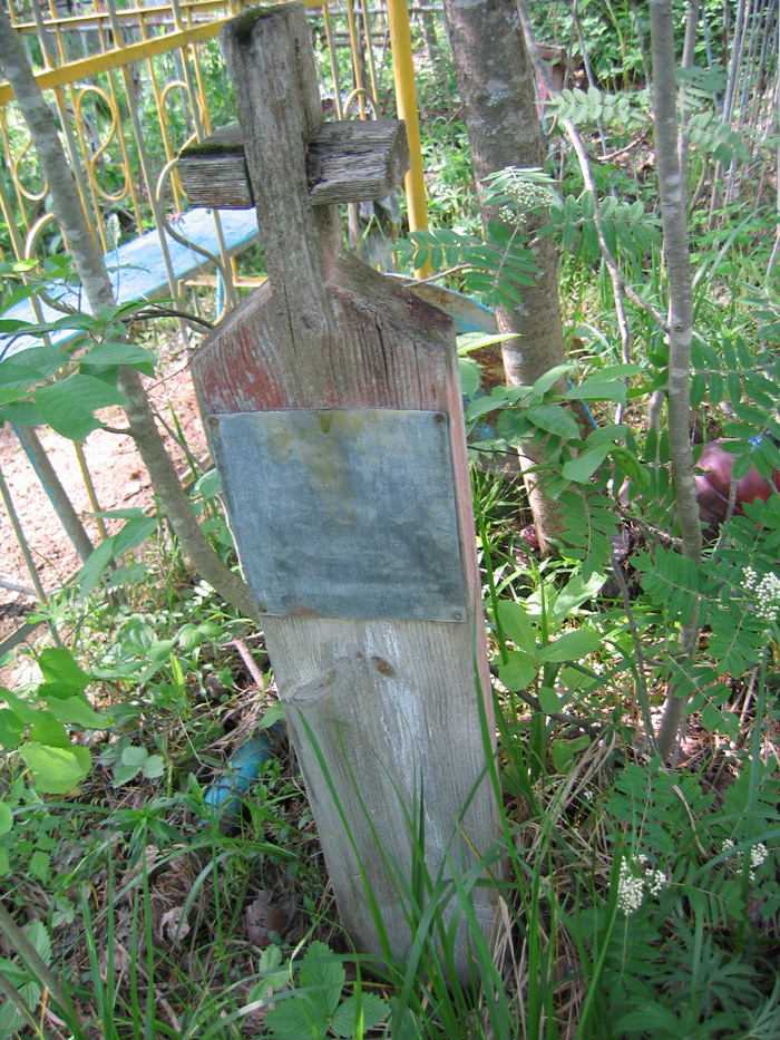 Puinen risti, jossa läkkipeltinen laatta. Teksti ei ole luettavissa.