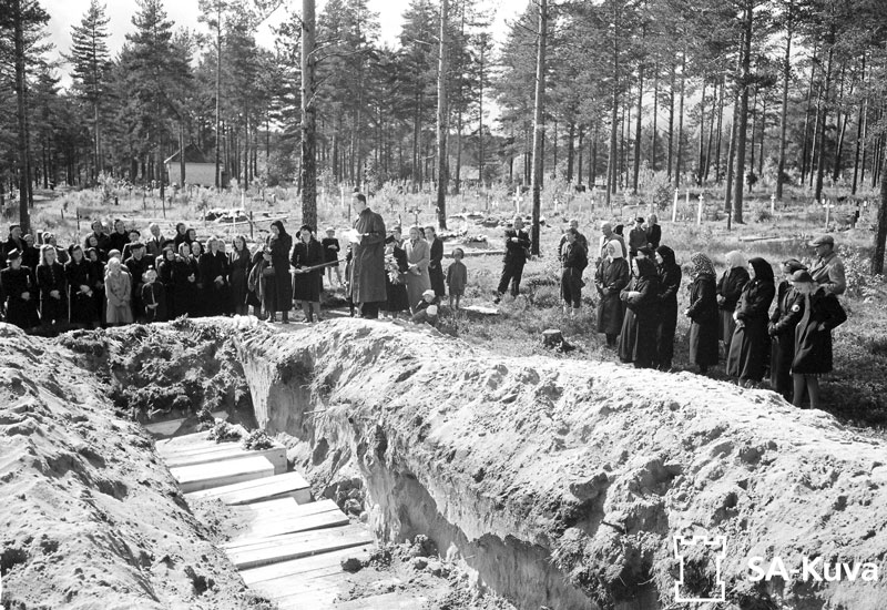 Kuva 3. Kirkkoherra Arvi Kujala siunaa Elisenvaaran pommituksen uhreja Otsanlahden uudella hautausmaalla 25.6.1944. SA-kuva