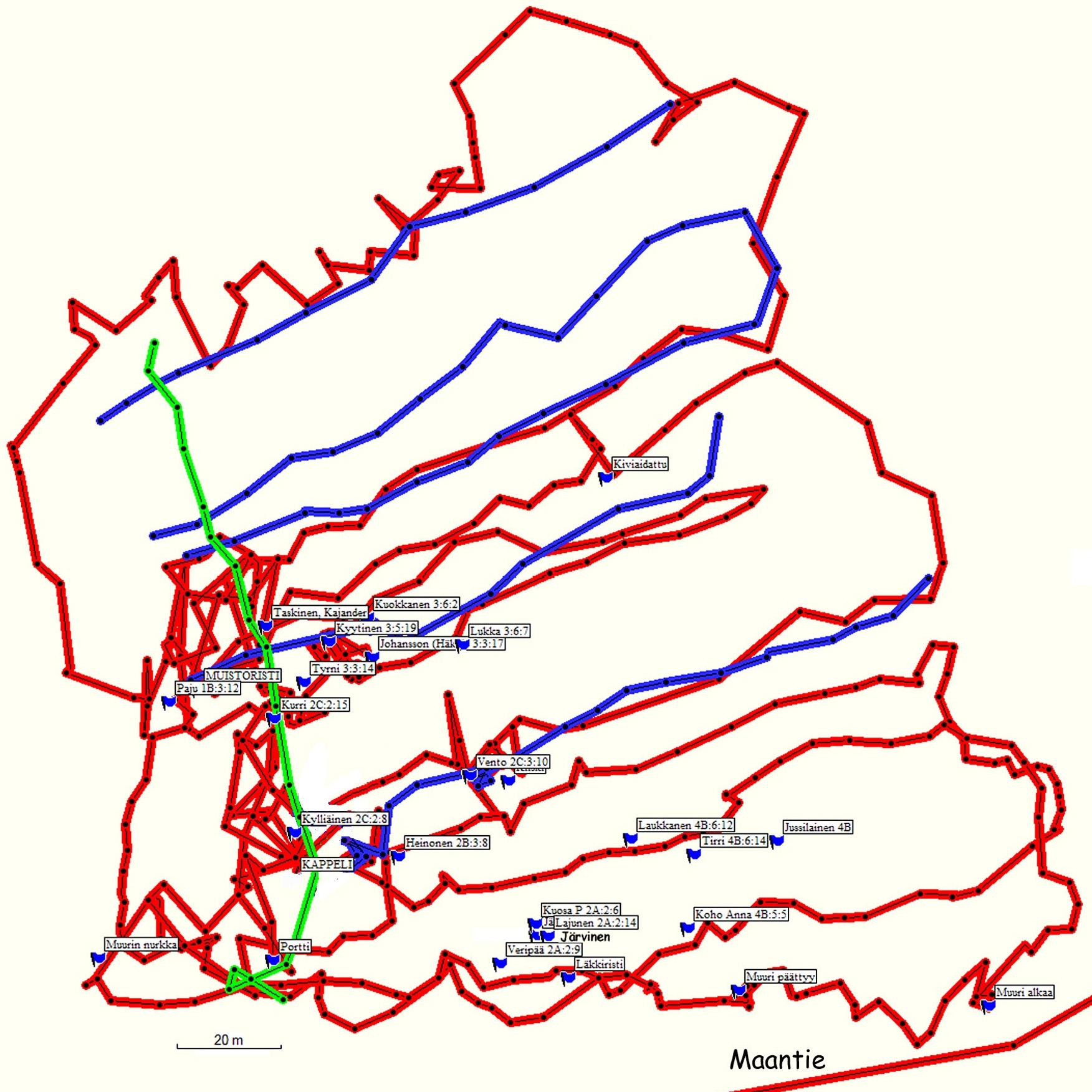 KartatKuva 1 näyttää GPS-laitteen piirtämän jäljen reitistäni, ensin pitkin rajoja (etelässä ja lännessä on osittain kiviaitaa jäljellä, idässä on hautausmaajätteiden kaatopaikkaa) ja sitten hautausmaan poikki polkuja seuraten (punainen). Siniset viivat ovat isompia, autolla ajettavissa olevia väyliä (autoja oli alueella useitakin, samaten uteliaita ihmisiä kunnostamassa hautoja). Portilta pohjoiseen päin kulkeva leveähkö pääkatu on merkitty vihreällä. Kuva 1. GPS-laitteen piirtämä jälki kävelystäni hautausmaan rajoja pitkin ja pitkin sen polkuja (punainen viiva). Vihreä pystysuora viiva on leveä pääkäytävä ja siniset viivat autolla ajettavissa olevia polkuja. Klikkaa kuvaa nähdäksesi sen suurempana!